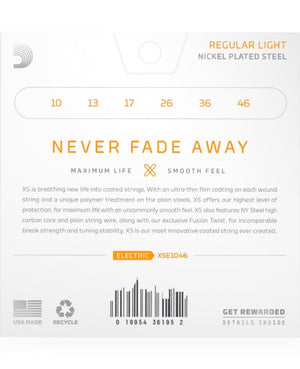 XS Nickel coated electric guitar strings provide the longest life of any D’Addario electric guitar string. Coated with our groundbreaking XS coating, these premium electric strings attain maximum life and a smooth, fast feel without dampening their outstanding tone. Constructed with a NY Steel core, reformulated nickel-plated steel wrap wire, and Fusion Twist technology, XS Nickel strings boast superior strength and tuning stability, plus richer harmonics, greater clarity, and remarkable definition with every sweep, slide, and bend. This 10-46 Regular Light gauge set is our most popular gauge, providing a nice balance of tone and playability.