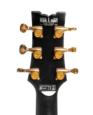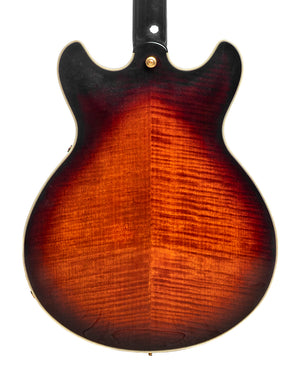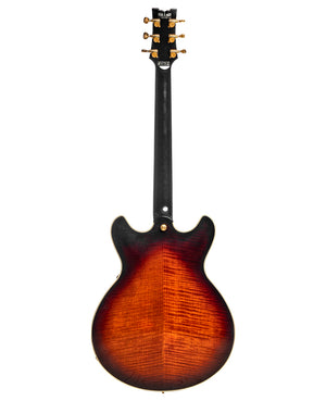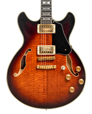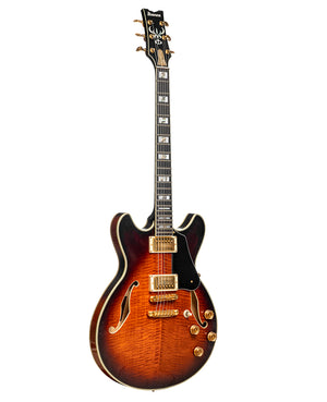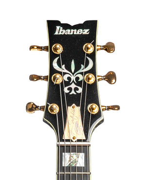 The Ibanez JSM100 uses the same construction concept as other ES models, but the wood choice is a bit different. The body, instead of using Maple laminate, uses figured Anigre, an African hardwood, for the laminate. The center block is Maple, as is the neck, which has an Ebony fingerboard. Decoration is similar to other Ibanez models in this range; hardware is gold plated, and the inlays include a mix of Abalone and Acrylic for the block markers on the bound, compound radius fingerboard.