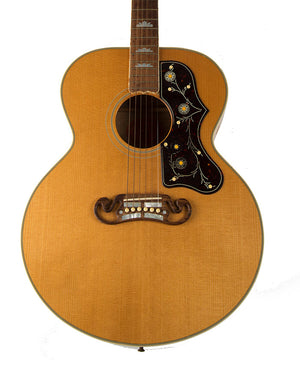 SJ-200. Guitar Gallery now has this amazing Gibson SJ-200 (1998) in stock. This is an amazingly sweet sounding Gibson that plays beautifully. Serial number 90438008. Featuring a spruce top, maple neck, flamed maple back and sides. It has a bound rosewood fretboard and an antique natural finish. The neck is true, with minimal fretwear, and has abalone crown inlays, a 1-3/4” nut and 25-1/2” scale. Classic rosewood mustache bridge and an engraved tortoise shell pickguard! Comes with its original hardshell case.