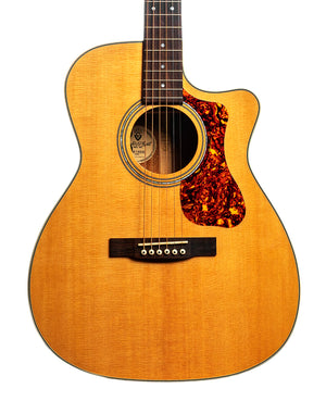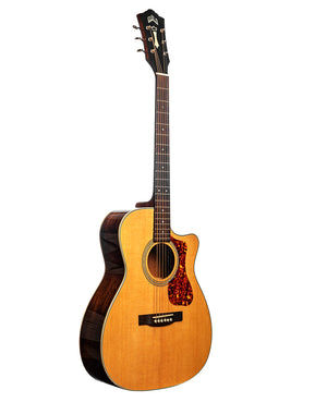 This mid-sized orchestra shaped acoustic is equally suited for strumming and fingerpicking, and produces a sweet, balanced tone. The perfect choice for the versatile musician, the OM-140CE features a solid Sitka spruce top, solid African mahogany back and sides, and an elegant cutaway for access to higher frets. The hidden Guild/Fishman AP1 with Sonicore pickup gives this guitar a perfectly amplified boost for gigs and live performances. Other premium features include a bone nut and saddle and mother-of-pearl rosette. This model also has a 1¾” nut width on a vintage shaped Guild neck, iconic Chesterfield headstock emblem reminiscent of 1960s Guilds, period-correct tortoiseshell pickguard, and Guild’s new premium acoustic gig bag.