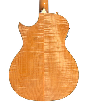Doyle Dykes is generally considered one of the greatest fingerstylists ever to pick up a guitar. And this is truly Doyle's guitar, built to meet his exact specifications. Grand Auditorium body crafted from figured maple with Chet-style thumbprint fretboard markers, Florentine cutaway and a pearl/abalone white rose peghead inlay that's ready for the stage lights.