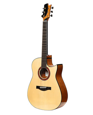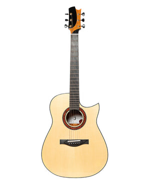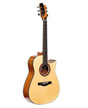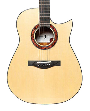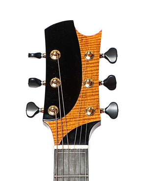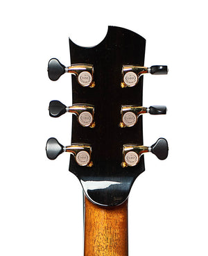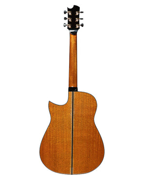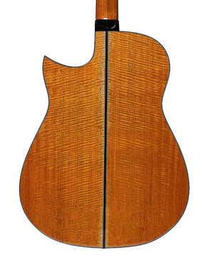 Soundboard - German Spruce, Rosette - Stained Glass Rosette, Bridge - Carved Ebony, Back & Sides - Figured Mahogany, Binding - Ebony, End Graft - Rectangular style wedge that matches binding, Backstrip - Ebony, Top braces - Sitka Spruce, Back Braces - Mahogany, Saddle - Compensated Bone, Nut - Scalloped and compensated bone, Neck - One piece Honduran Mahogany, Headcap Veneer - Two Tone, Tuning Machines - Gotoh 510 tuners in gold with Ebony buttons, Fingerboard - Ebony with ebony binding and maple purfling, Fingerboard inlay - none, Fretwire -Medium Tall, Fretboard Radius - 20", Case - Hoffee Custom Hardshell Case, Body Joint - 14 Fret, Scale Length 25.25", Nut Width - 1 3/4", Saddle string spacing - 2 5/16", Finish - Nitrocellulose Lacquer, Strings - John Pearse Light .013 - 053, Tapered Body Manzer Wedge, Cutaway - Florentine.